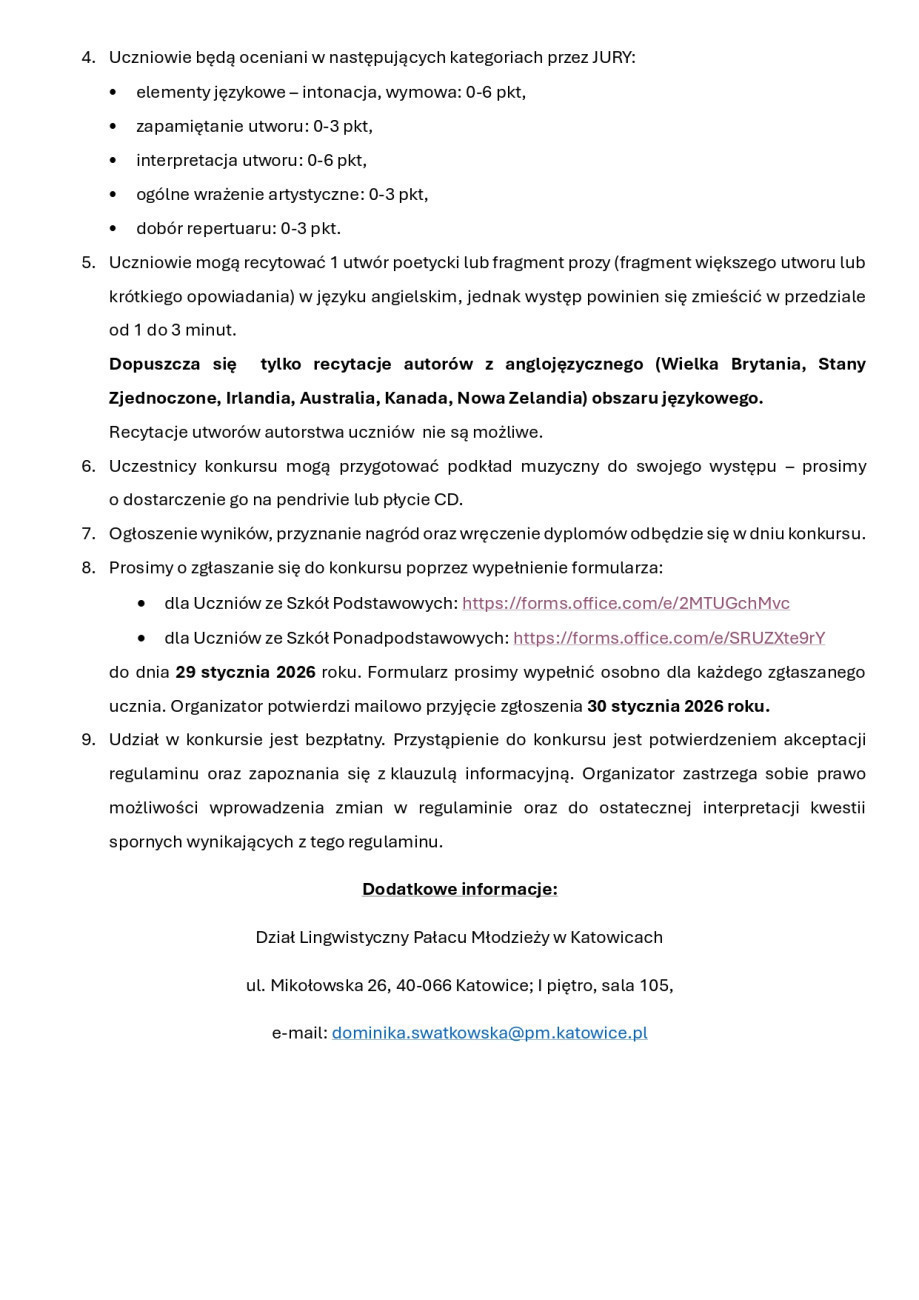 Dział Lingwistyczny czeka na zgłoszenia uczniów i uczennic z klas 7-8 szkół podstawowych, a także tych ze szkół średnich do 29 stycznia. Inicjatywa została objęta honorowym patronatem Śląskiego Kuratora Oświaty w Katowicach oraz ogólnopolskiego czasopisma dla nauczycieli "Języki Obce w Szkole". Chętnych do działu śmiałków z województwa śląskiego zapraszamy do udziału w IV edycji wydarzenia. Szczegóły w załączonym poniżej regulaminie i na stronie www organizatorów.