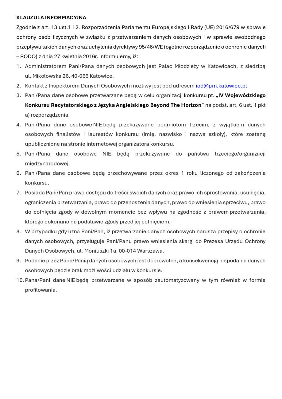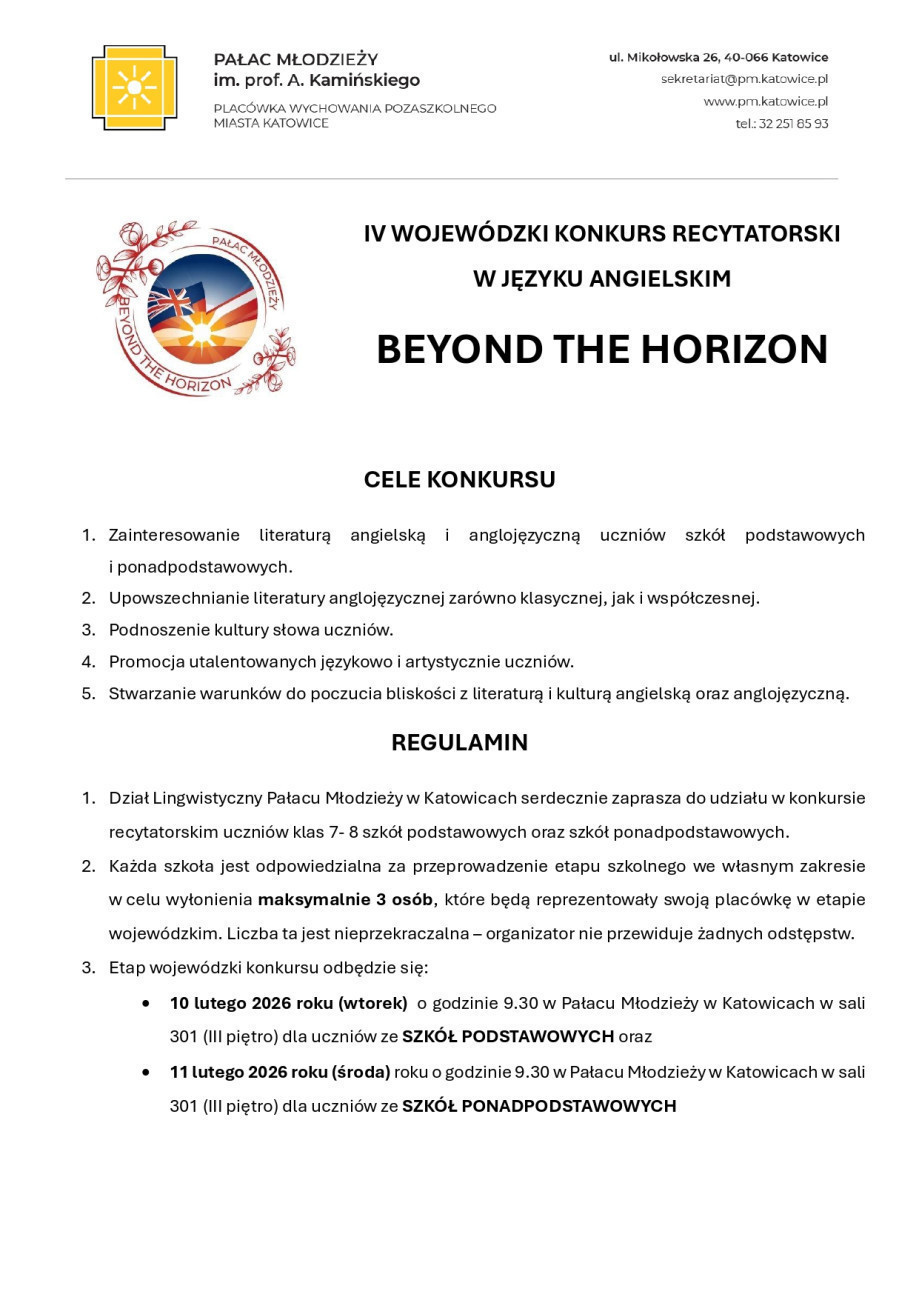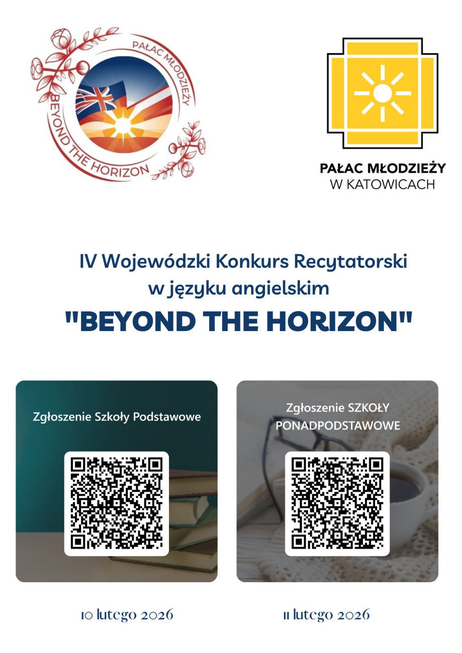 Kolejny rok z rzędu Pałac Młodzieży w Katowicach zaprasza miłośników poezji i prozy, a także języka angielskiego do udziału w wojewódzkim konkursie recytatorskim w języku angielskim "Beyond the Horizon". I tym razem odbędzie się on pod patronatem czasopisma "Języki Obce w Szkole".