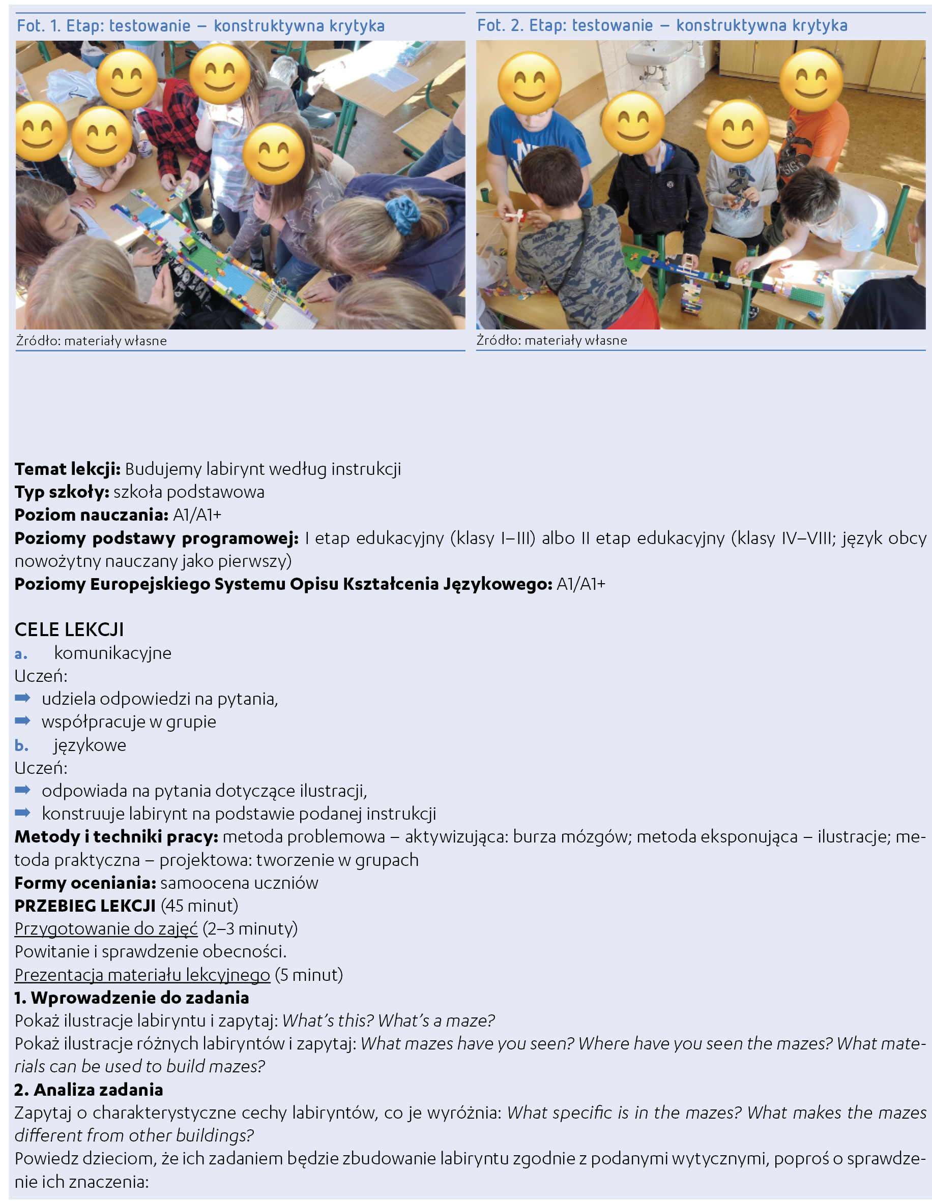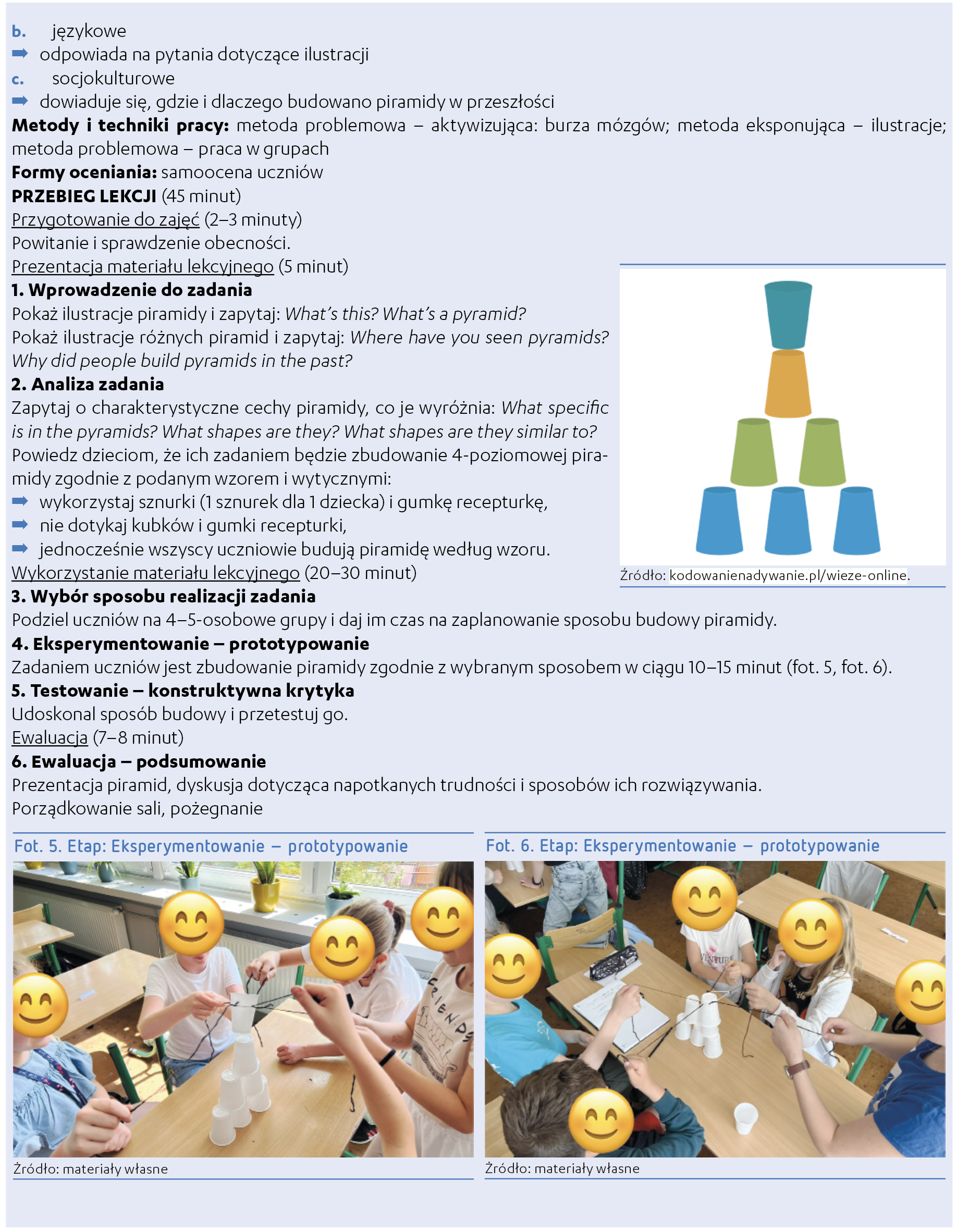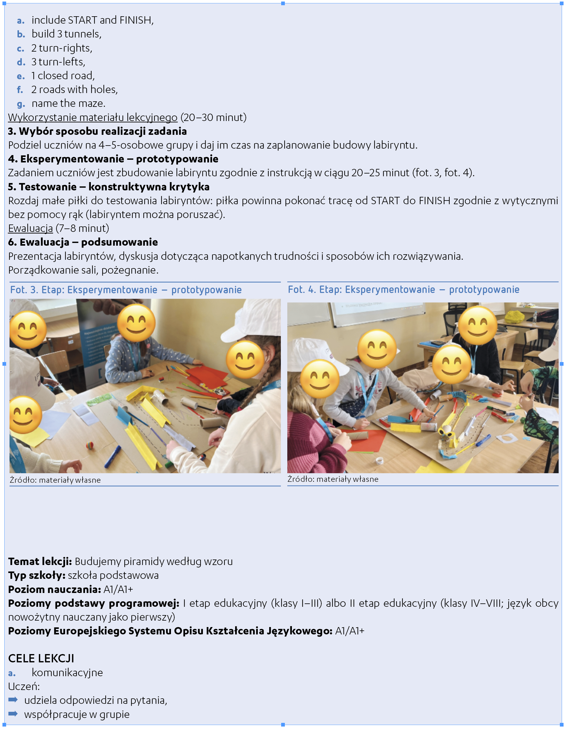 Testowanie i konstruktywna krytyka – testowane modele lub prototypy podlegają ocenie efektywności i funkcjonalności, a uzyskane dane i wyniki oraz zaobserwowane zmiany są analizowane i omawiane. Na tym etapie uczniowie sprawdzają, czy to, co stworzyli, działa poprawnie, zgodnie z planem lub poleceniem. I tutaj pojawiają się emocje zarówno pozytywne, jeśli osiągnięte zostały wytyczone cele, jak i negatywne, jeśli testowanie nie powiodło się i założenia nie zostały zrealizowane. Nauczyciel chwali, ale także wspiera, wyjaśnia i zachęca do podjęcia kolejnych prób, do działań naprawczych, jeśli jest taka potrzeba, a także tonuje emocje.