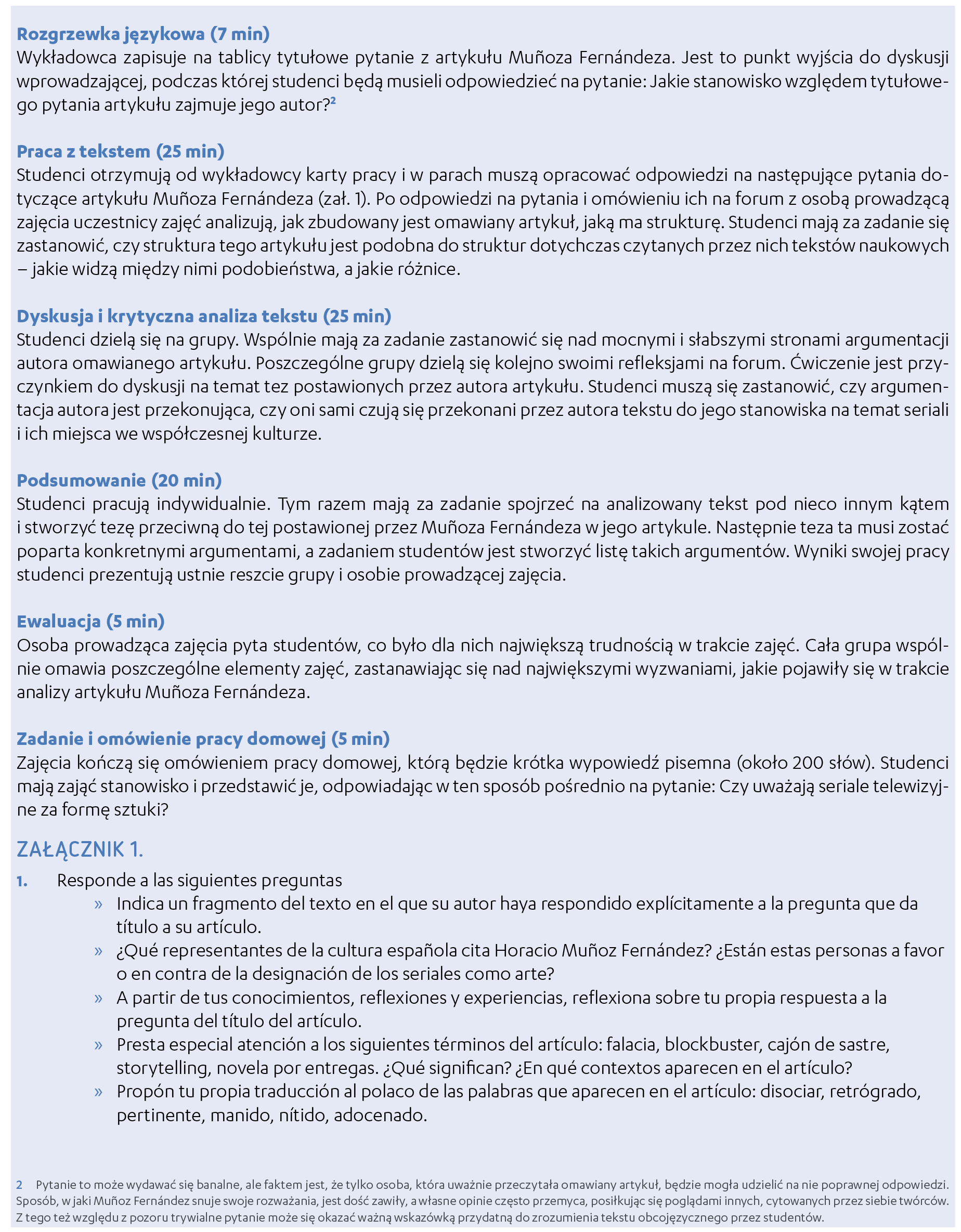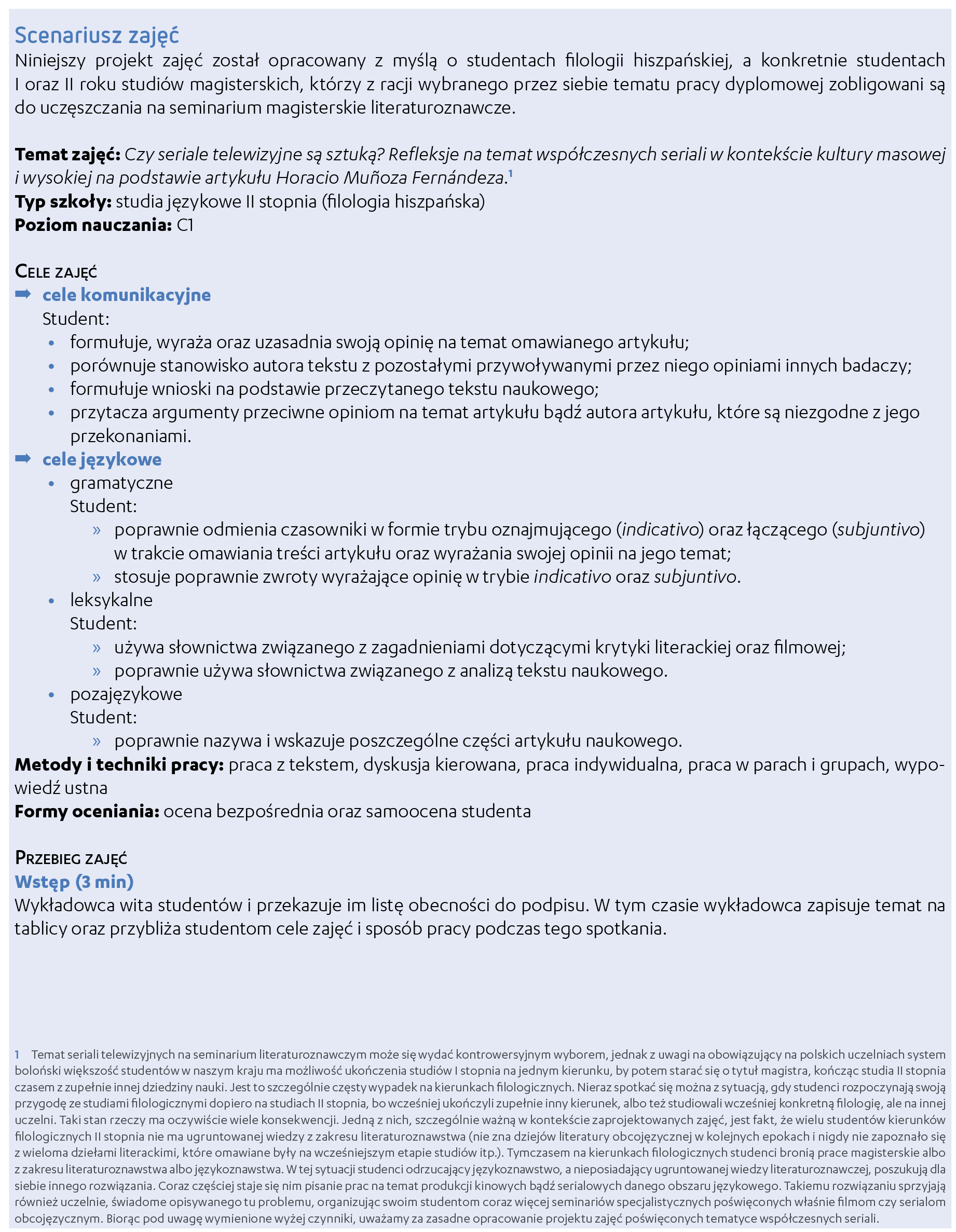 W artykule przedstawiamy scenariusz zajęć dla studentów filologii hiszpańskiej, który stanowi przykład realizacji powyższego postulatu.