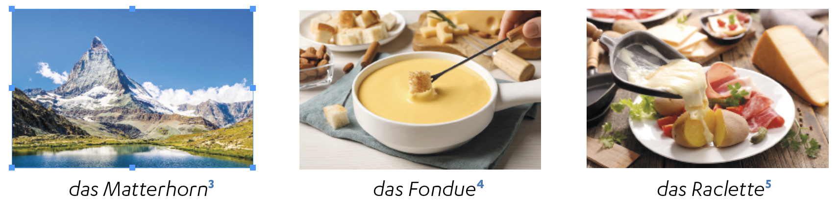 Wariant A: Uczniowie czytają kolejno po jednym zdaniu, natomiast jeden uczeń ochotnik stoi przy tablicy (mapie, ekranie) i wskazuje (ręką, linijką, wskaźnikiem laserowym) kolejno wymienianie miejsca oraz zdjęcia ze szczytem Matterhorn, a także potrawami fondue i raklet.