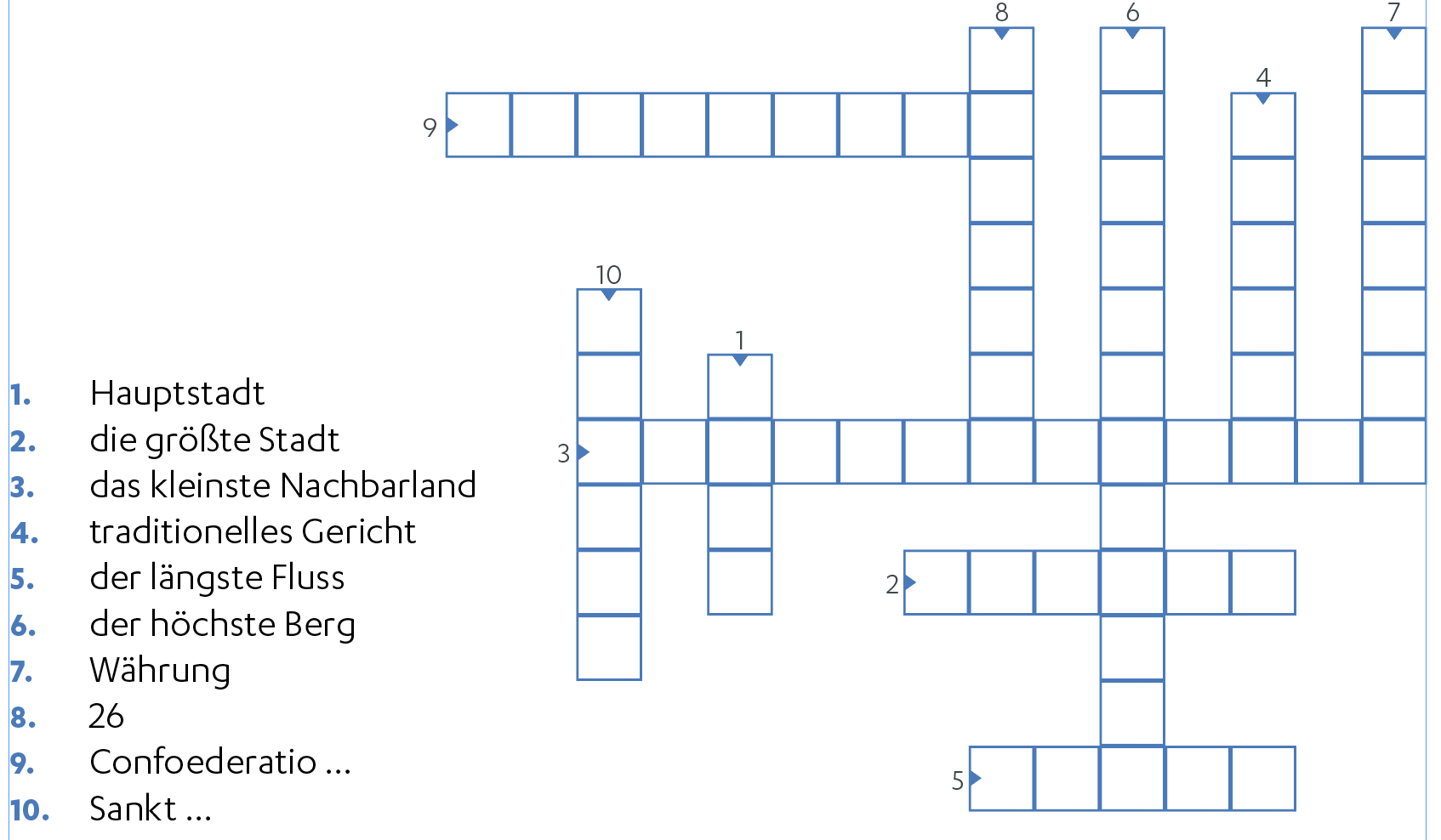 Rozwiązanie: 1. Bern 2. Zürich 3. Liechtenstein 4. Fondue 5. Rhein 6. Dufourspitze 7. Franken 8. Kantone 9. Helvetica 10. Gallen